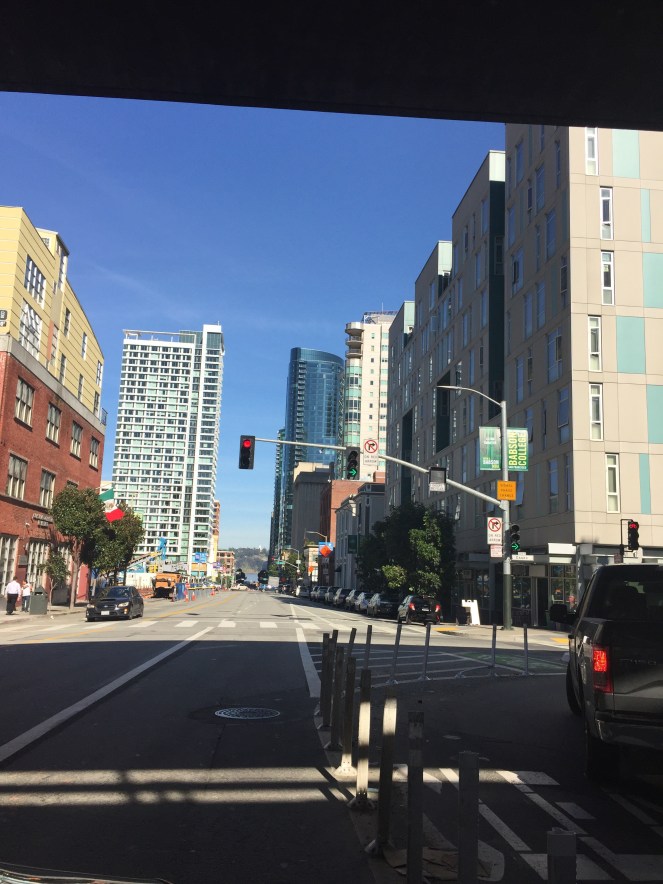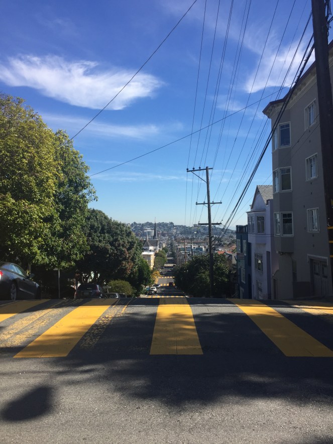 Superato uno dei 50 colli sui quali è costruita San Francisco eccoci…. Finalmente in città. Abbiamo lasciato la freeway e ci siamo avventurate tra le strade saliscendi.