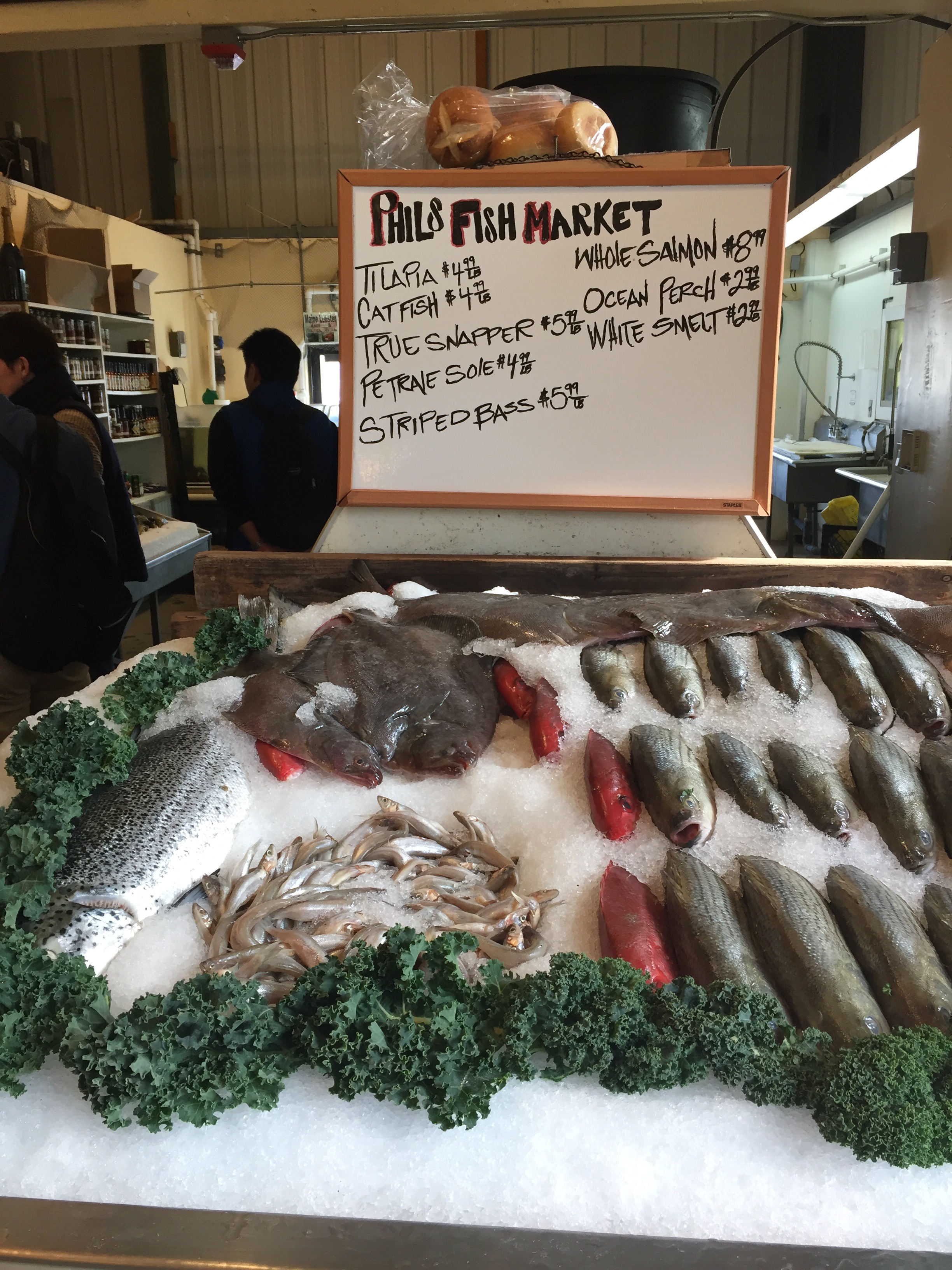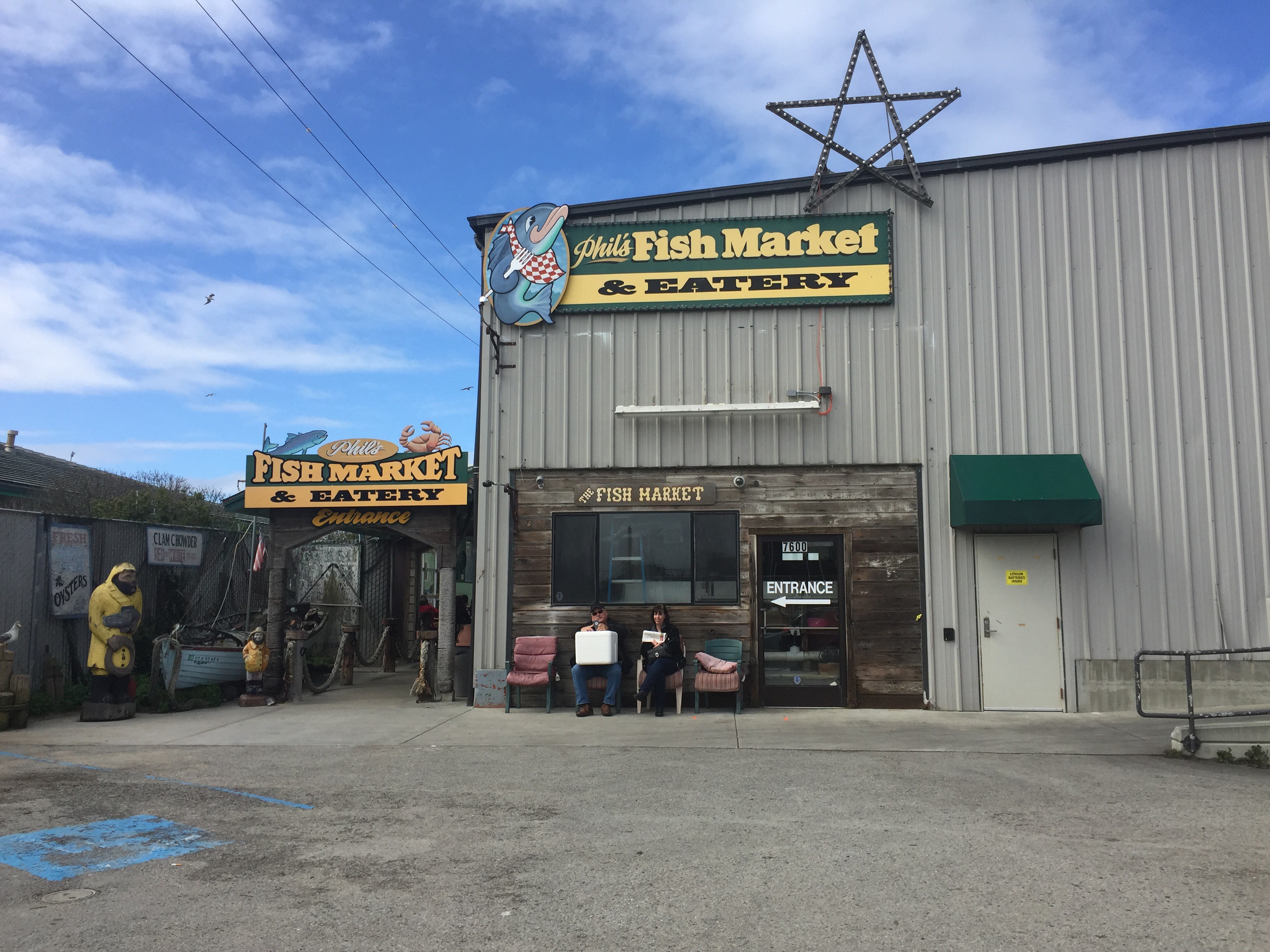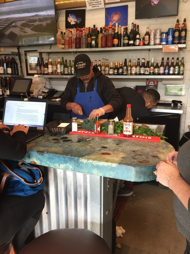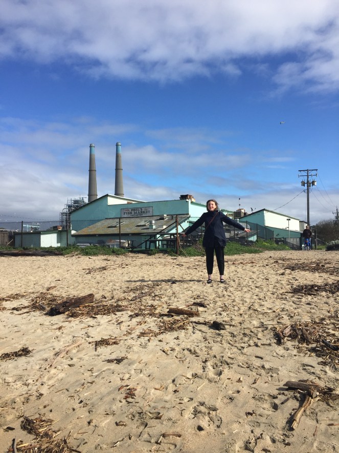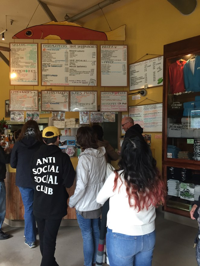 Poi, prima di arrivare al mare, il paesaggio cambia ancora e ci siamo trovati in una zona paludosa, Moss Landing. Abbiamo seguito le indicazioni per il molo e ci siamo fermati per un pranzo veloce di pesce al Phil’s Fish Market. Tanta gente che andava e veniva, piattoni di fish and chips, ma anche di ‘Cioppino’ (una zuppona di pesce con granchio in bella vista), sandwiches di pesce, clam chowder (zuppa di vongole e patate e panna, e altro che non ho capito),a richiesta ostriche, e poi pesce, pesce, pesce.