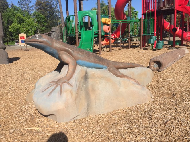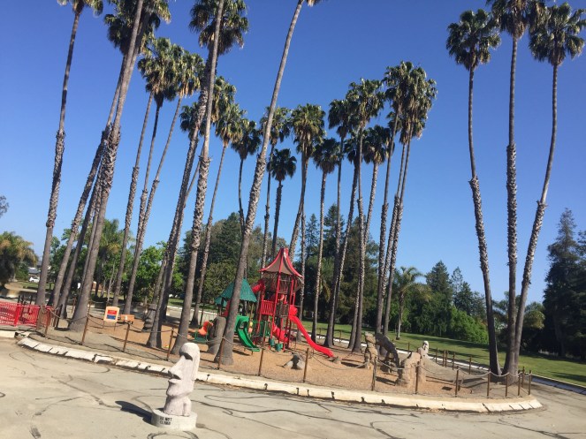 La scorsa domenica è stata la volta di Las Palmas Park, un parco di grandissime dimensioni in Sunnyvale, non troppo lontano da casa. Realizzato nel 1971 e rimodernato nel 2013, offre uno spazio gioco per bambini, uno spazio gioco per toddler (cioè bambini di 1 o 2 anni, che si muovono da soli ma non così bene da potersi arrampicare su una scaletta di corda o essere lasciati soli a 2-3 metri di altezza), campi da tennis, area pic nic, prato libero, area giochi d’acqua, spazio coperto multifunzionale con bagni.
