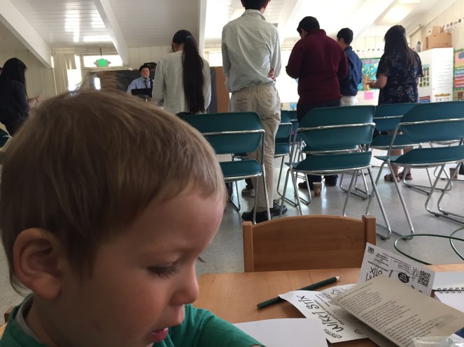 Molto spesso qui in America queste chiese organizzano per i bambini delle attività ad hoc. A volte si tratta di un vero e proprio catechismo, altre, come in questo caso, semplicemente predispongono dei tavoli con colori, didò, giochi vari.