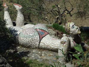 Si entra da un cancello all’ombra del viadotto e si segue il sentiero tra i murales realizzati sotto la superstrada. Puntellano il sentiero delle sculture gigantesche, decorate con mosaici dai colori accesi e saturi che ricordano i parchi sinuosi di Gaudì, rivelando la natura speciale del posto in cui ci troviamo.