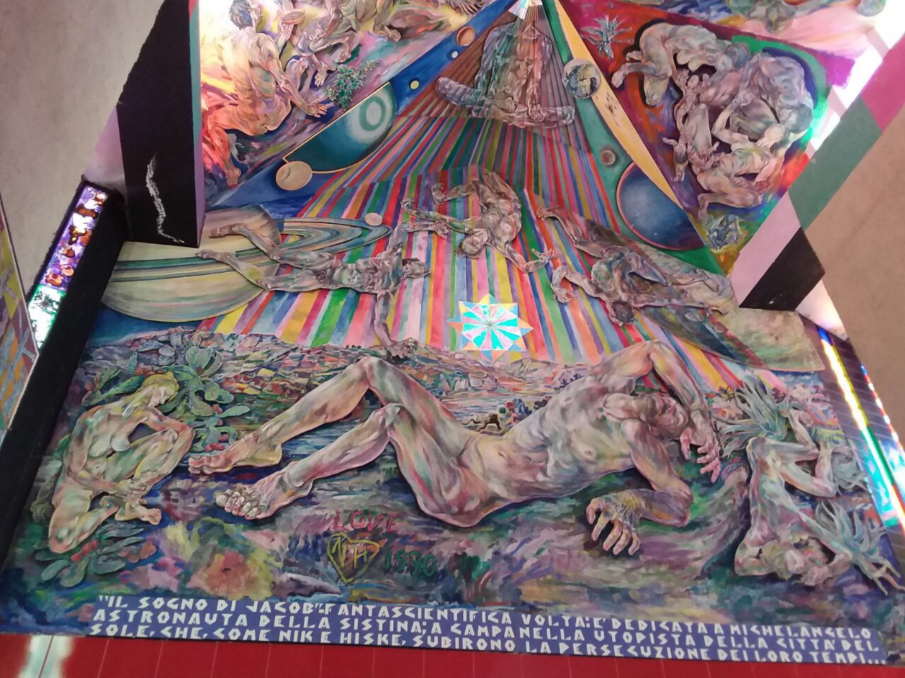 Si passa accanto al labirinto in costruzione, alla foresteria, alla vecchia stazione della Calabro Lucana, primo alloggio dei due fondatori, poi si sale, con gli occhi tesi a intravedere dove si nasconde la, così l’hanno ribattezzata, ‘Cappella Sistina della Calabria’.