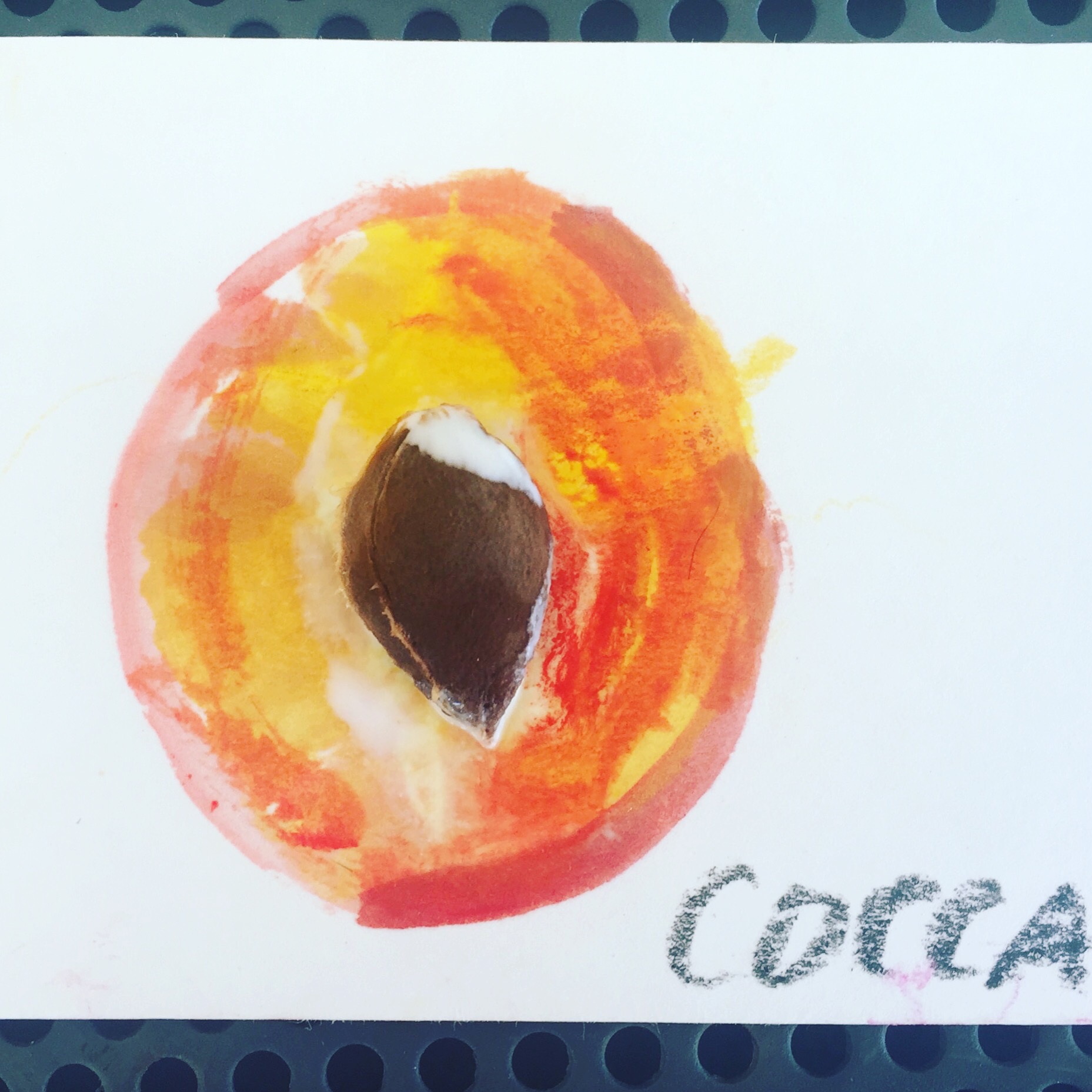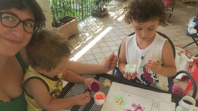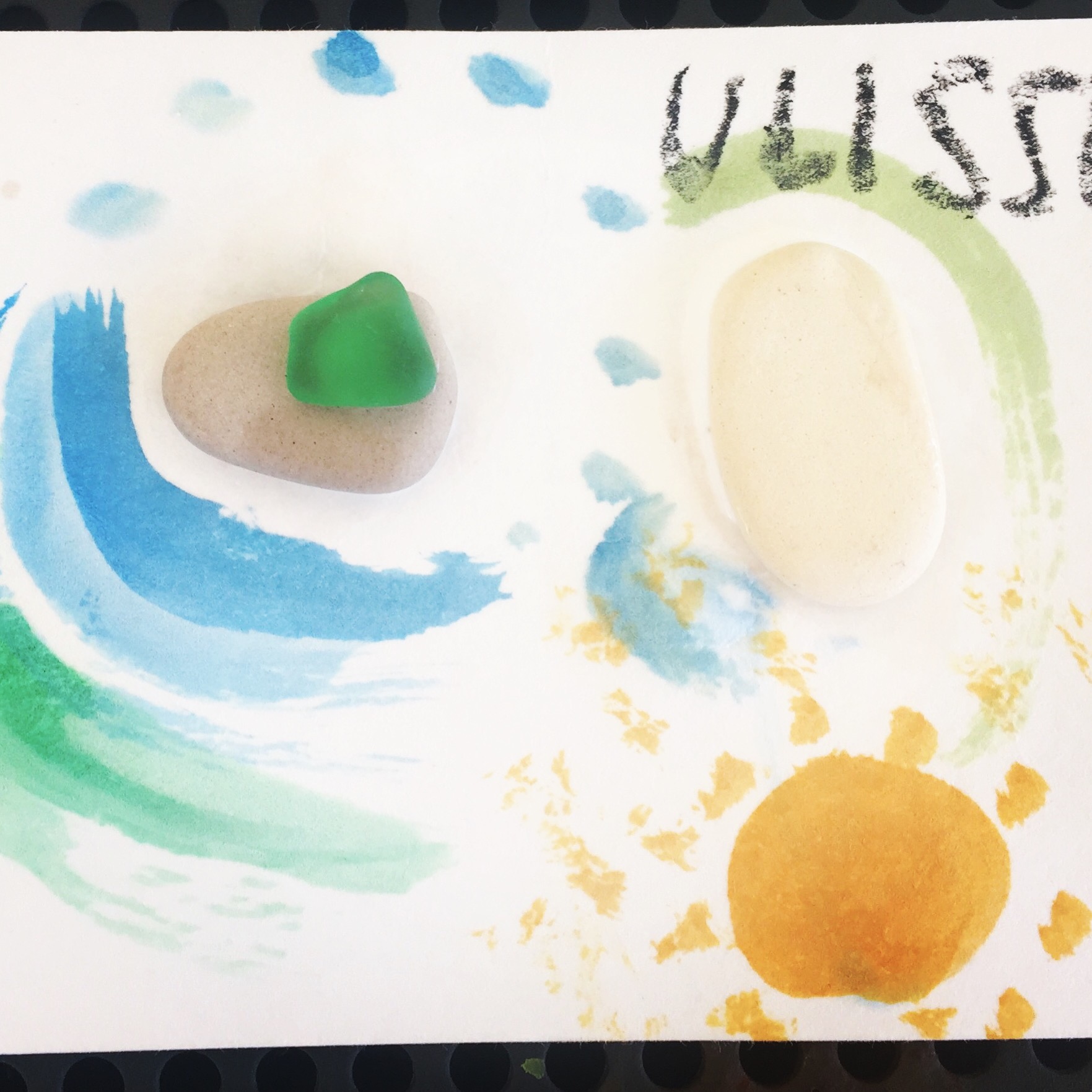 Con le pietre, i vetrini, la sabbia, ma anche con tutto quello che trovate e che vi avanza potete mettervi a fare dei bellissimi collage e poi completare con tempere e pennelli. Noi abbiamo usato gli acquerelli e abbiamo fatto il mare e l’albicocca.