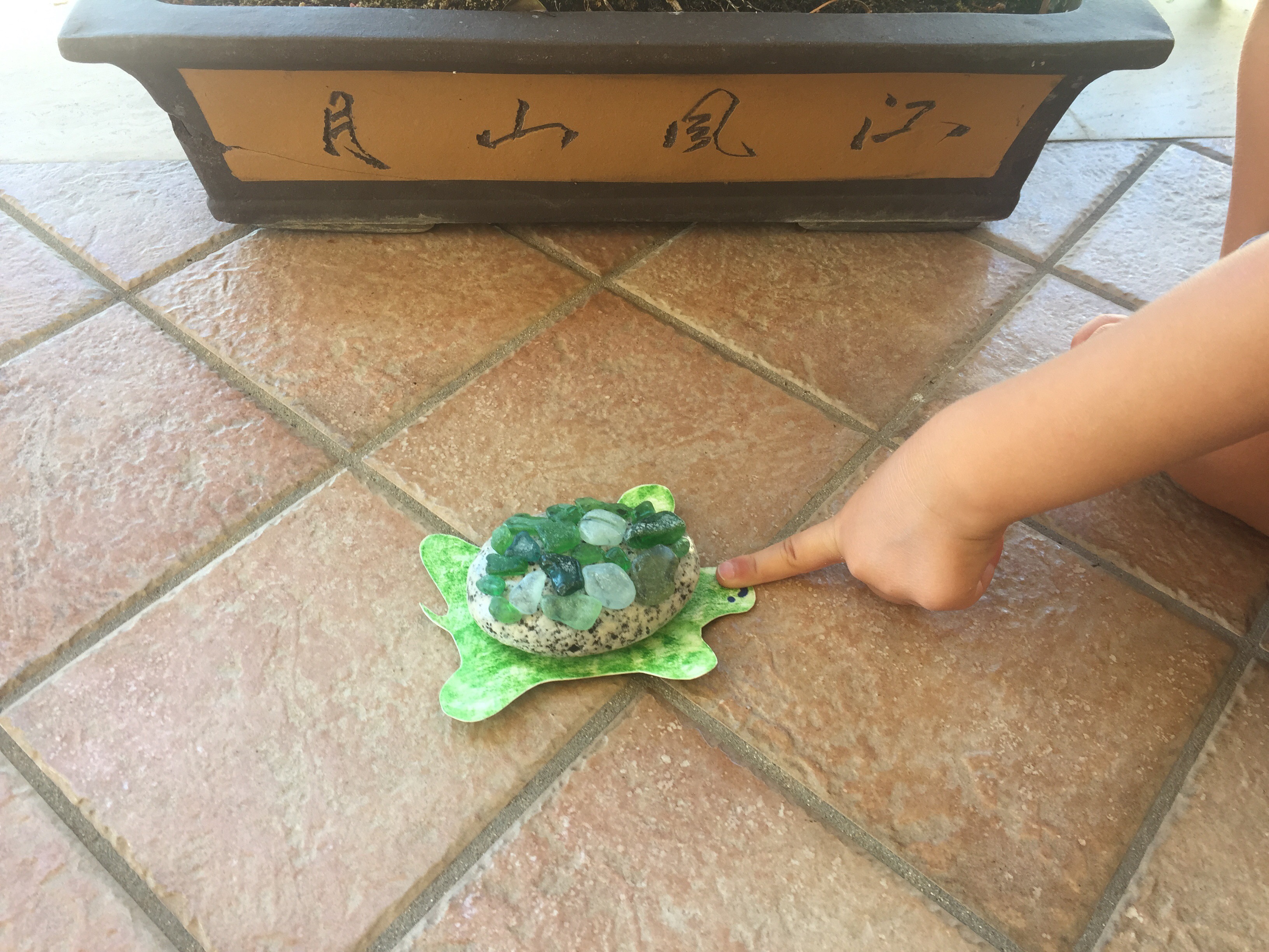 Facilissima da fare, basta trovare un bel sasso liscio di medie dimensioni, tanti vetrini (possibilmente verdi, ma anche qualcuno marrone può andare bene), un cartoncino sagomato e colorato di verde per fare la base e, ovviamente, la colla Vinavil. Il resto è intuitivo e questo il nostro risultato.