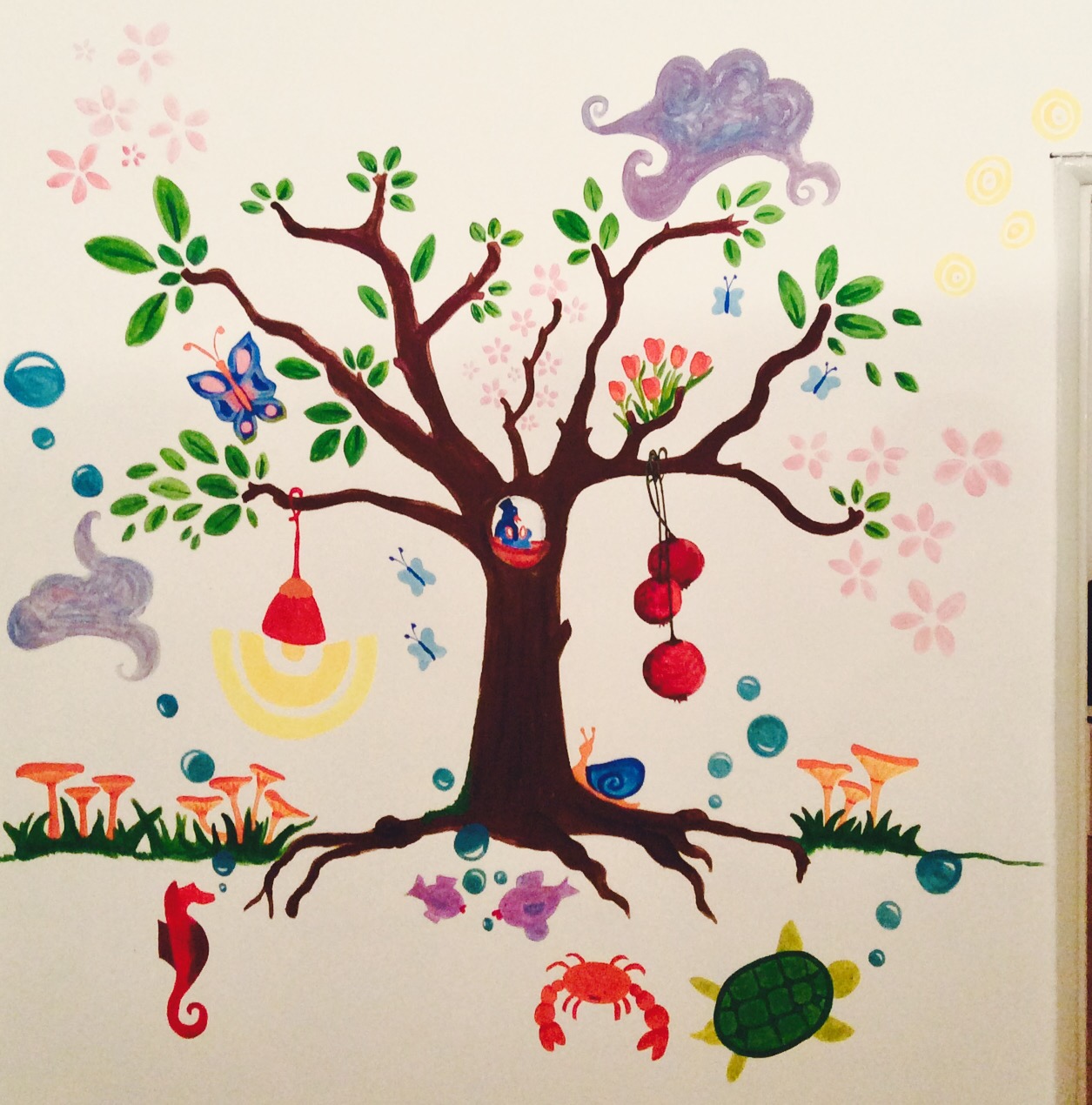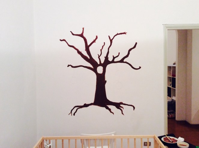 Ha foglie e fiori e frutti. Melograni, nidi, uccellini e da un ramo pende pure una lampada. Ha radici, sotto le quali nuotano pesci e tartarughe…. nel cielo lucciole, farfalle e bolle blu. Lumache, funghetti… peccato che abbiam cambiato casa, altrimenti dipingerei qualcosa ogni sei mesi.