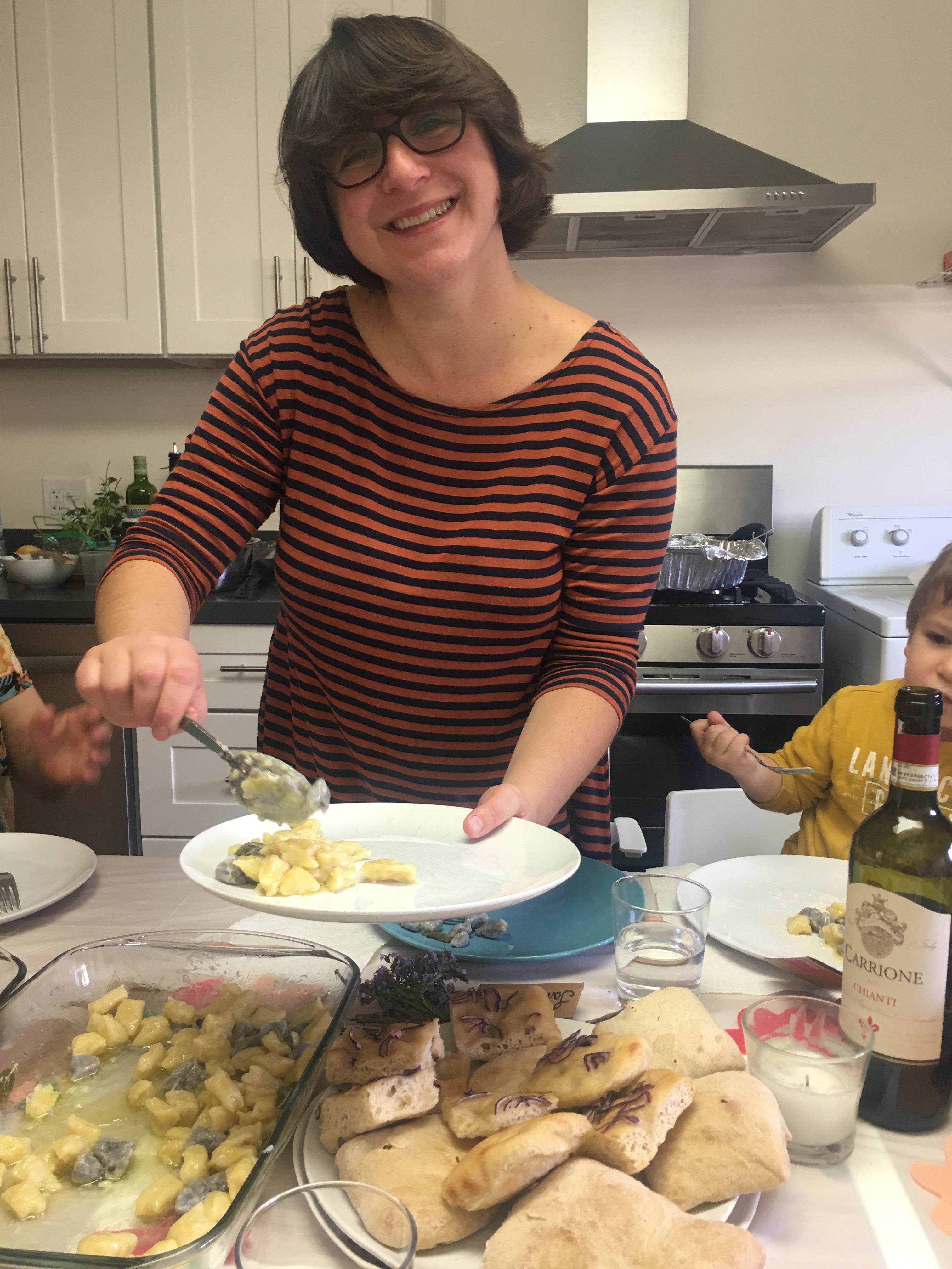 Focaccia alla genovese e focaccia con cipolle, gnocchi di Thanksgiving burro e salvia gialli e viola (patate, zafferano e patate viola).